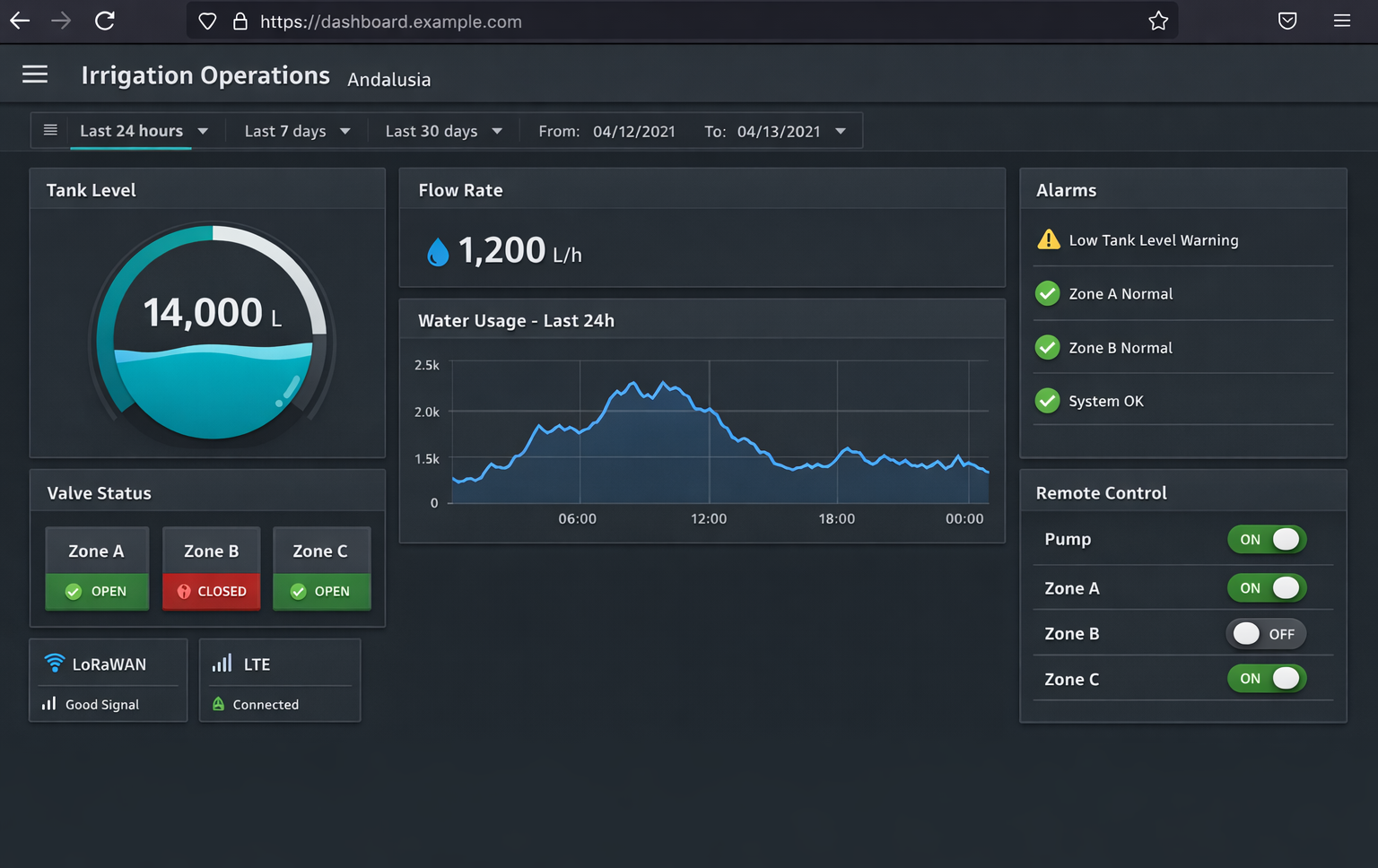 Operations DashboardBrowser-based monitoring and remote control for tank level, flow, alarms, and irrigation zones.