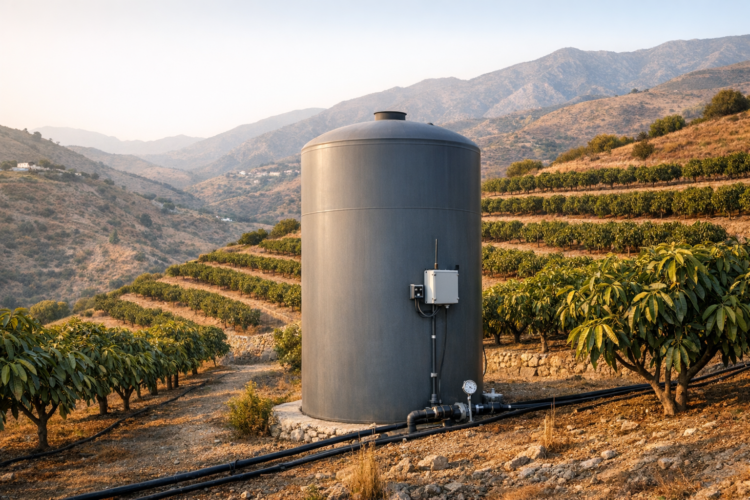 Field ContextDeposito tank placed within a plantation on sloped agricultural terrain.